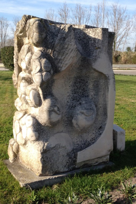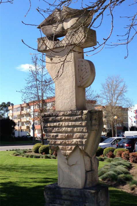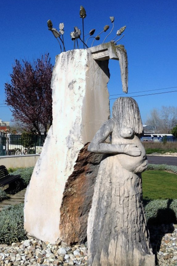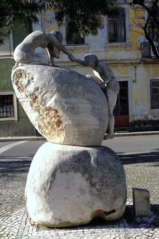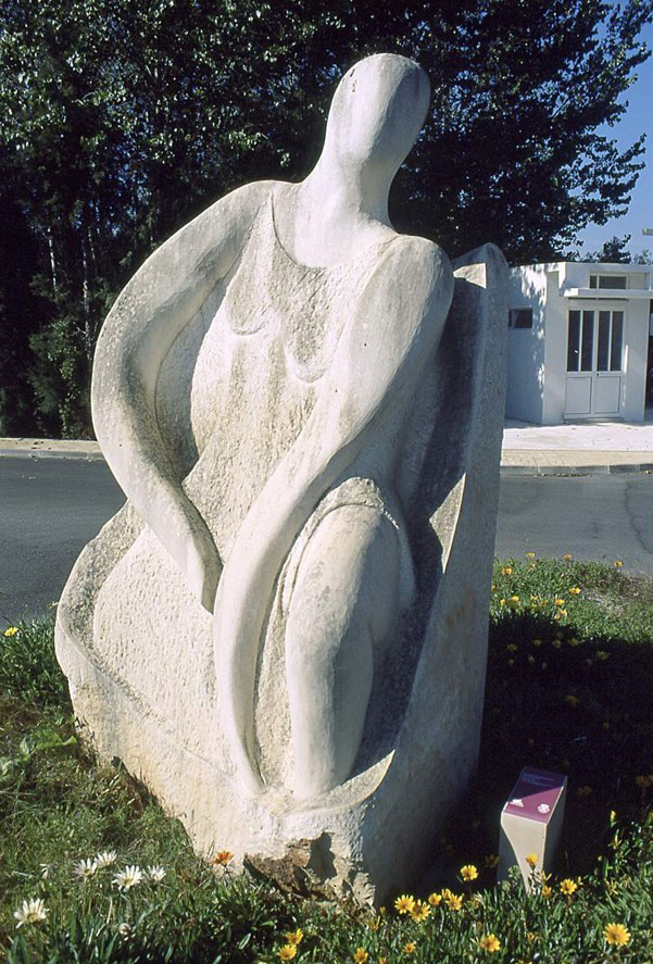 Descrição/Tema: Escultura de arte contemporânea. A artista afasta-se do talhe tradicional a partir de um monobloco de pedra, utilizando a técnica de ensamblagem em articulação com a criação de diversas texturas. Na parte inferior, a escultura tem a seguinte inscrição com a letra “D” em grande plano abrangendo todas as palavras “DITAMES / DIREITOS / DEVERES / DIGNIDADE / DA MULHER”.