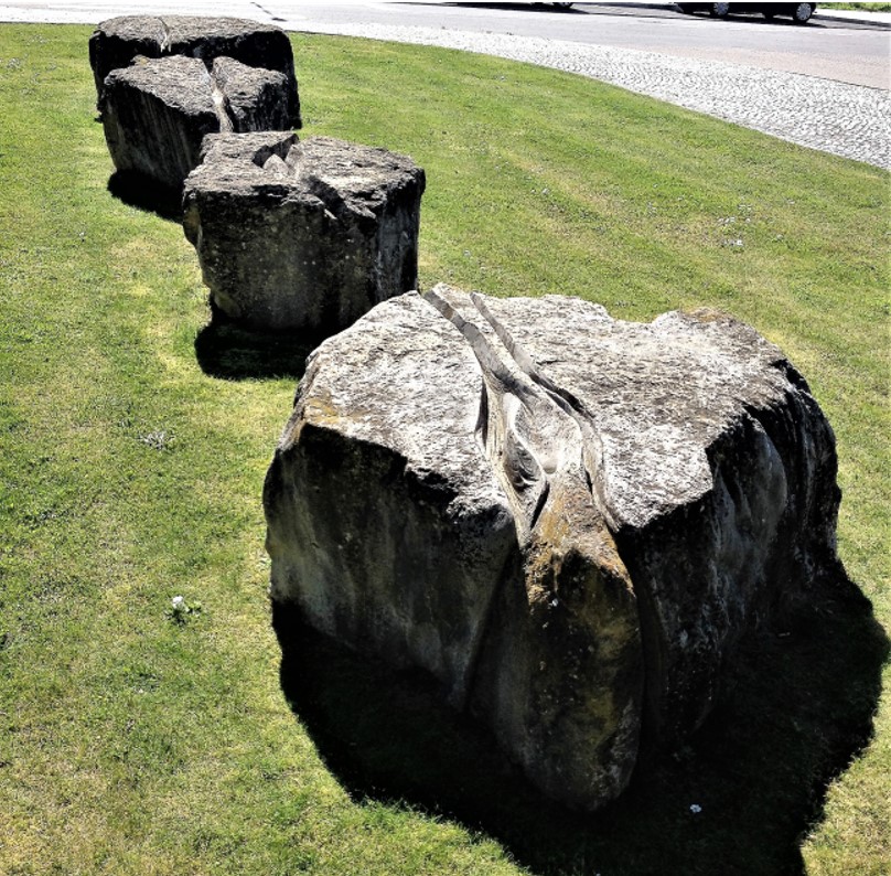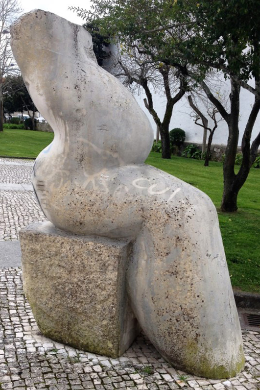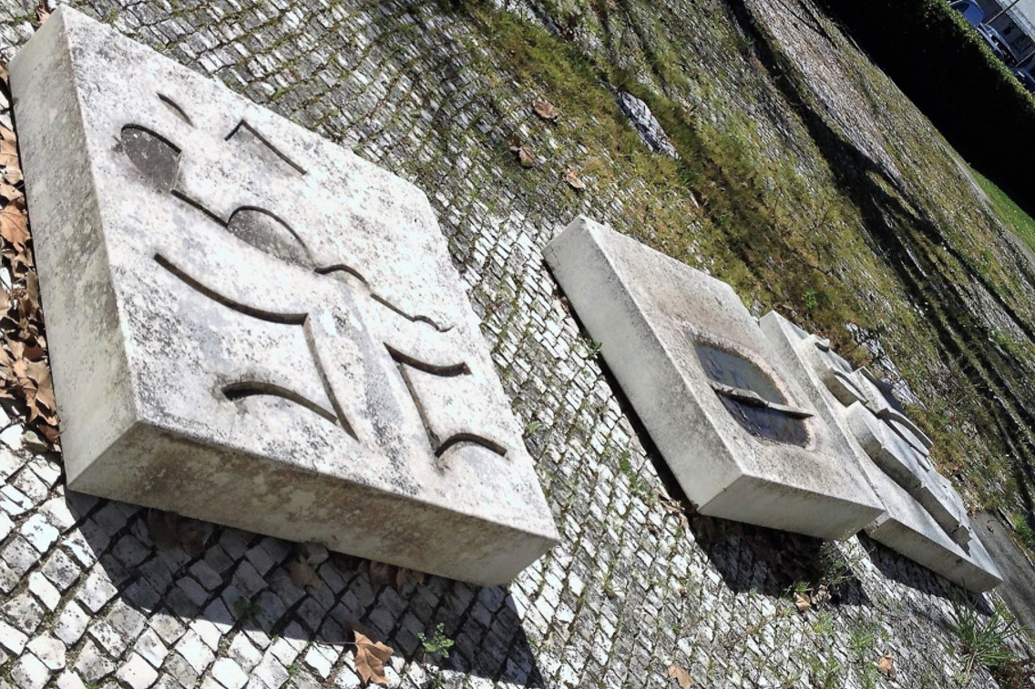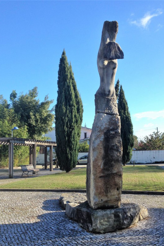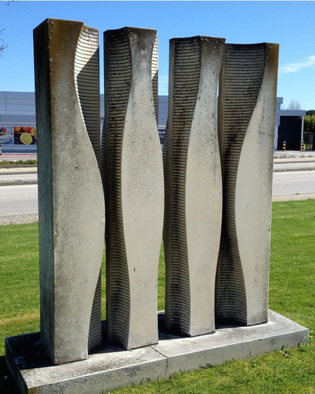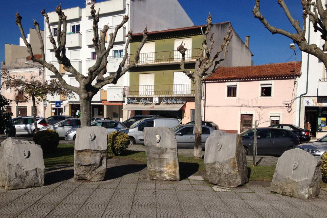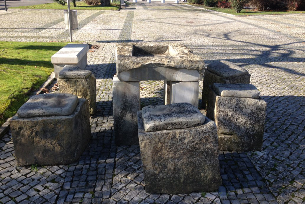 Descrição/Tema: Grupo escultórico de arte contemporânea figurativa, de características aproximadas à “arte pública de carácter utilitário”, podendo fazer-se uma associação com o “design de equipamento”, pela relação direta que assume com o público, permitindo o seu usufruto. Esculpido em vários blocos de pedra, o grupo, inicialmente composto por uma mesa cinco bancos e duas cadeiras [agora incompleto pela falta das cadeiras (novembro 2010)], de linhas geométricas, conjuga diversas texturas, umas de carácter mais tosco, aproximada à textura original da matéria, outras mais trabalhadas “estriadas” e “lisas”.