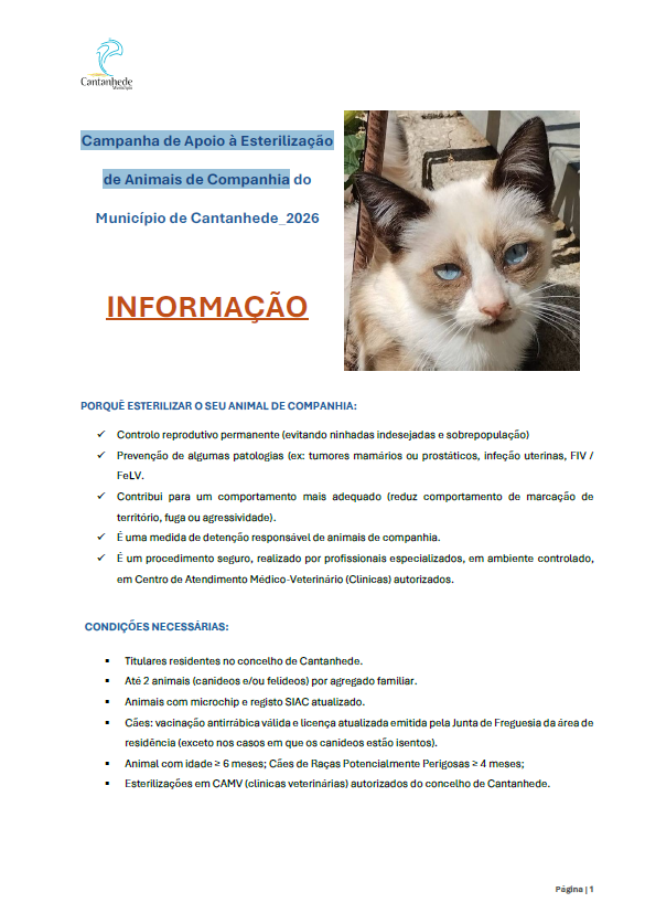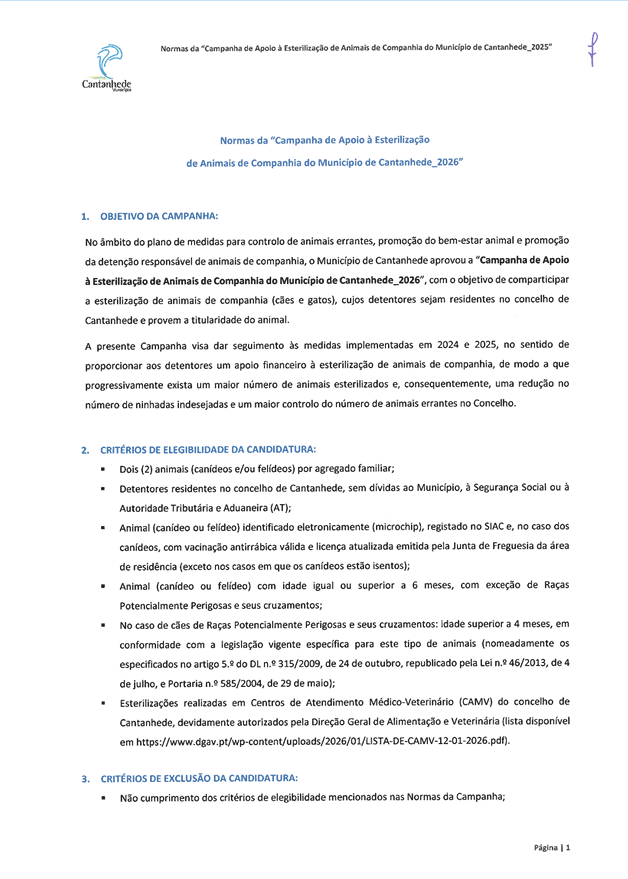 Normas da Campanha de Apoio à Esterilização de Animais de Companhia do Município de Cantanhede 2026