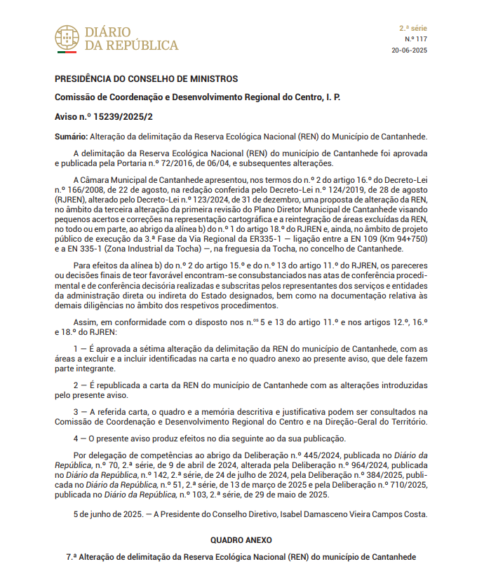 Aviso n.º 15239/2025/2 - 7ª Alteração da delimitação da Reserva Ecológica Nacional (REN) do Município de Cantanhede
