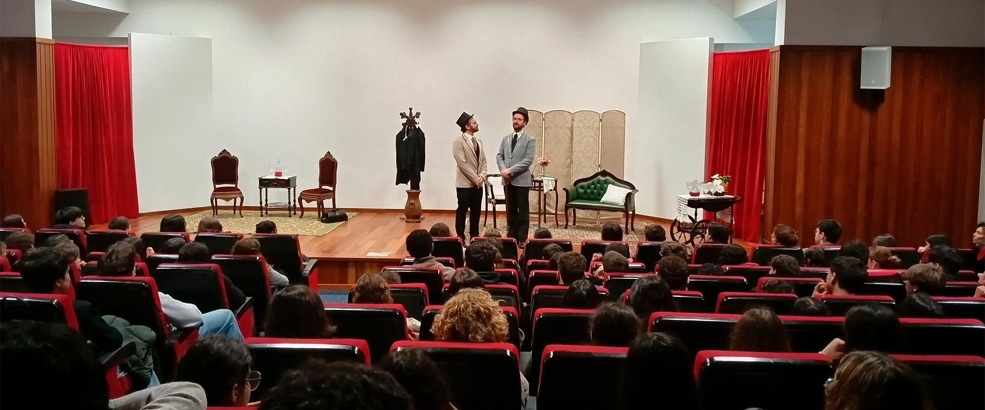Mais de duas centenas de alunos do 11.º ano assistiram esta segunda-feira, 9 de fevereiro, à representação teatral da obra “Os Maias; episódios da vida romântica”, de Eça de Queirós. O palco foi o auditório do Centro Paroquial de S. Pedro, em Cantanhede.A apresentação esteve a cargo da companhia de teatro ETCetera e contou com a presença de estudantes de Cantanhede e da Tocha, que frequentam os agrupamentos de escolas Lima-de-Faria e Gândara Mar.Integrada no Plano Anual de Atividade da Rede de Bibliotecas de Cantanhede para o presente ano letivo, a iniciativa teve organização conjunta da Rede de Bibliotecas de Cantanhede e dos docentes da disciplina de Português dos agrupamentos de Escolas Gândara Mar e Lima-de-Faria. O Município de Cantanhede assegurou a deslocação dos alunos e docentes da escola da Tocha.“Os Maias: episódios da vida romântica” é uma das obras literárias mais conhecidas de Eça de Queirós que, de forma realista e bem-humorada, retrata a sociedade abastada de Lisboa da segunda metade do século XIX. Este texto é de leitura obrigatória na disciplina de Língua Portuguesa, no 11.º ano de escolaridade.O grupo ETCetera, que já realizou várias peças de teatro para os alunos dos agrupamentos de escolas do concelho de Cantanhede, é uma companhia de teatro criada e sediada em Vila Nova de Gaia e que tem vindo a trabalhar o teatro com atores profissionais, cujo trabalho assenta sob o lema “Teatro para TODOS”.Ambicionando proporcionar diferentes momentos teatrais a todo o tipo de grupo, género e idades, o grupo propõe-se realizar experiências artísticas que se reflitam nocrescimento dos espectadores, enquanto alunos, mas igualmente enquanto indivíduos, fazendo do teatro um veículo de cultura e, simultaneamente, de educação.O ETCetera foca a sua atividade nos mais jovens, com projetos que procuram também integrar o público geral. Esta vertente surge numa tentativa de aproximar o público das artes performativas e quebrar alguns preconceitos que rotulam o teatro como enfadonho, inacessível e dispendioso. Sob a premissa “com pouco, fazer muito”, o grupo pretende mostrar que o teatro pode ser divertido, criativo e para todos.